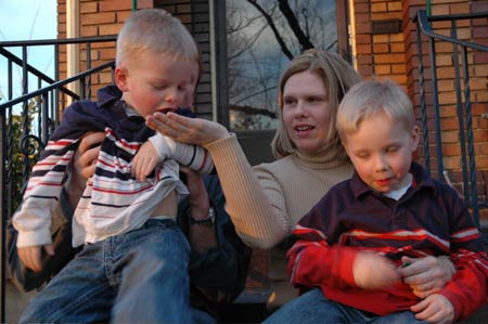 The light was fading fast, so we all scurried to the porch and everyone got into their respective positions. Kyle, the five-year-old, sat in Beth’s lap (he is her exact replica), and Eli, the three-year-old, sat in Dave’s lap (he is Dave’s exact replica, except he is much cleaner when he eats his food). I stood a few feet away, and since we both own the same camera I started taking photos immediately. The boys remained still for all of TWO WHOLE SECONDS, and then the wiggling started, violent wiggling and looking at places other than the camera.
