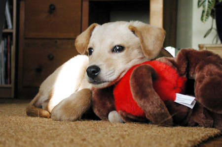 Our Nikon D70 is getting fixed (sensor problem, grrr) and will be in the shop indefinitely. Thus, this vintage photo of Chuck at about seven weeks old. And that’s his stuffed monkey he used to carry around in his mouth on walks. Jon and I were listening to this comic the other night who made the argument that the only things men want more than sex are 1) to be involved in a heist, and 2) to own a monkey because how cool would it be to be driving home from work knowing that you’ve got a monkey waiting for you in a closet? I think I know what I’m getting Jon for our anniversary.