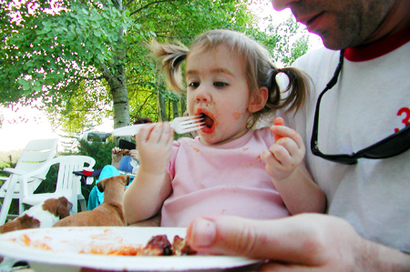 The baby, she likes barbecue Heather B. Armstrong | September 6, 2005 And so does Chuck whom you can see begging in the background.