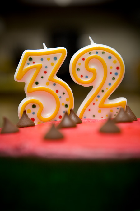 Those are Hershey’s Kisses sitting on top, arranged to look like the black seeds in a slice of watermelon. And when we were getting ready to cut the cake, I handed one of the Kisses to a very reluctant Leta and told her it was chocolate. She looked skeptical, but then hesitantly opened her mouth and let it sit on her tongue for a second. Right then Jon called me back into our office so that he could show me a desktop pattern he had made for the occasion, a large picture of me and Leta with HAPPY 32 written across the top, and when we returned to the kitchen not even 20 seconds later, all 13 Kisses were gone. Vanished. And Leta suddenly had a brown goatee.