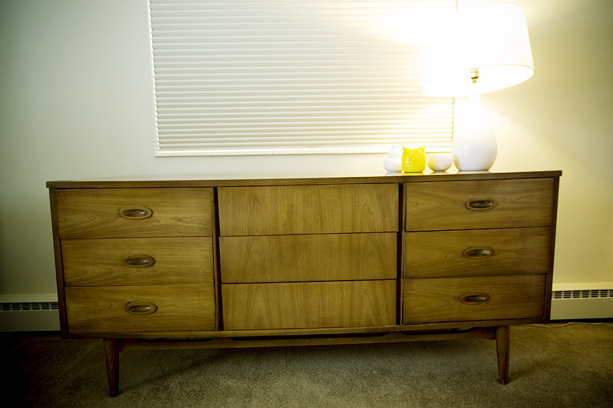 I found this dresser at a local mid-century shop called the Green Ant for $220 bucks, a total steal. It’s in great shape, and we have it sitting against the west wall in Leta’s room. Before this we were using a very cheaply made, cardboard piece of crap that kept falling apart whenever we tried to put her tiny socks in a drawer, so it’s a welcome change to have a piece of furniture that actually works.