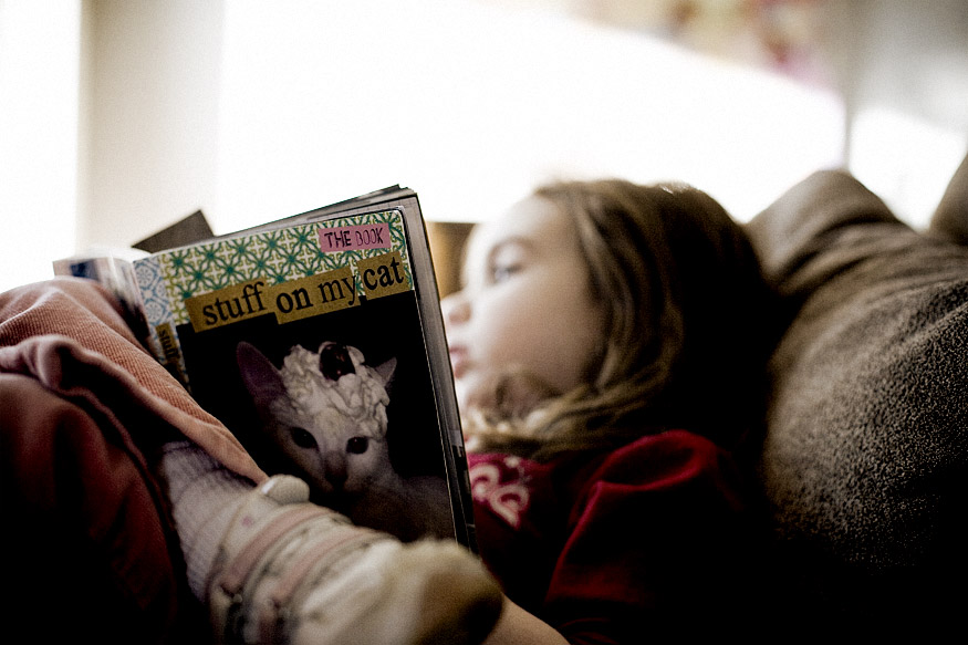 Leta spends a leisurely afternoon lounging on the couch, reading up on the various things one could conceivably balance on top of a cat. She’s taken this book with her to school every single day this week. I’m not quite sure that I want to know what her teachers think of me.