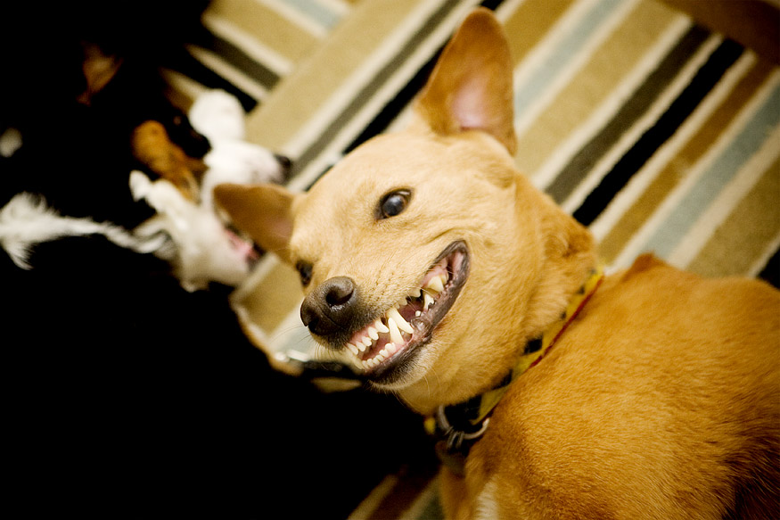 Their wrestling session lasted almost three hours this morning, and just when we thought they’d had enough Chuck would grab the rawhide bone and go taunt Coco with it. And she can’t ever win that fight because he’s so much bigger than she is. I like to think of this photo as a representation of how he is laughing maniacally inside, how he’s almost drunk with power.