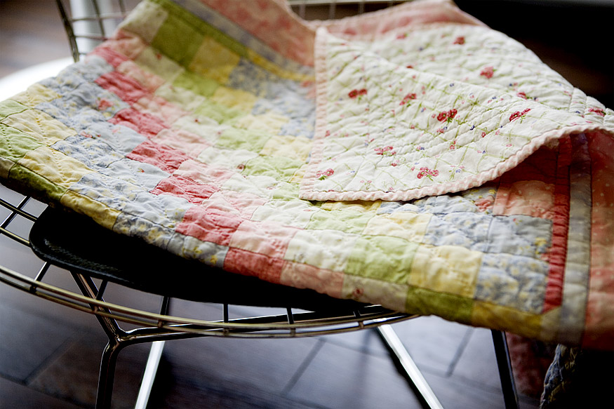 I was straightening up a storage closet this weekend when I realized, holy crap, I own a lot of quilts. In fact, I own so many I guess you could say that I collect them, so this week I’m going to feature some of my favorites here in the style section. This was the one Jon’s mother Della hand-quilted for Leta when she was born. She asked what the colors in her nursery were going to be, I said pink and green, and this is the beautiful piece that she designed. I’m making Leta treat this with the utmost respect because I want her to be able to pass this along to her own children should she choose to have any. If she chooses not to, well then, I can always leave my life savings to the goldfish.