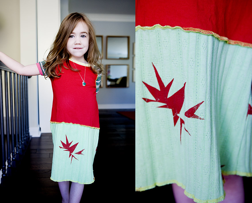I was actually browsing Etsy shops in bed one morning looking again for clothing for Leta when she looked over at my screen, pointed specifically at this dress and said I LOVE THAT ONE. It’s from a shop called CourtneyCourtney, and the artist uses new and recycled fabrics. That day Leta’s favorite color was red, so of course this one spoke to her. Luckily, this morning her favorite color was still red, so there was no struggle getting dressed, none at all. And because of that I already marked today in the VICTORIOUS column, instead of the one titled WOULD RATHER HAVE SKEWERS JABBED UNDER THE NAIL OF MY BIG TOE.