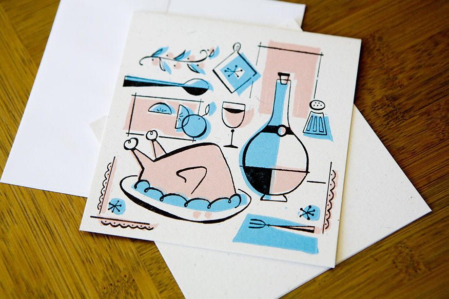 While Jon was in Knoxville he got to stop into Yee-Haw Industries (Etsy shop here), a shop that specializes in products such as letterpress posters promoting special events, music acts and theatre shows to handmade, woodcut, fine art prints. All of their work is custom-to-order, designed, set, and pressed by hand. And Jon went NUTS. Brought me back a bag full of goodies, including these hand-printed letterpress cards that feature illustrations from an artist named Jennifer Jessee. I love the vintage feel of the illustrations, they remind me of the cookbooks my mom used when I was growing up. I’ll be featuring more from Yee-Haw here for the rest of the week, and you should imagine me writing these entries in my Southern drawl.