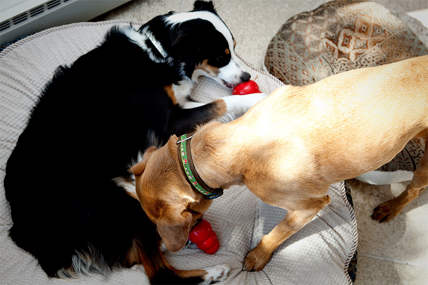 Many thanks to those of you who sent in suggestions regarding the contents of the Kong. Last night I stuffed both of them with peanut butter and stuck them in the freezer. About an hour after this photo was taken both Chuck and coco were lying on the living room floor, their paws in the air, panting like they had run a marathon. This is probably the closest they will ever come to having sex.