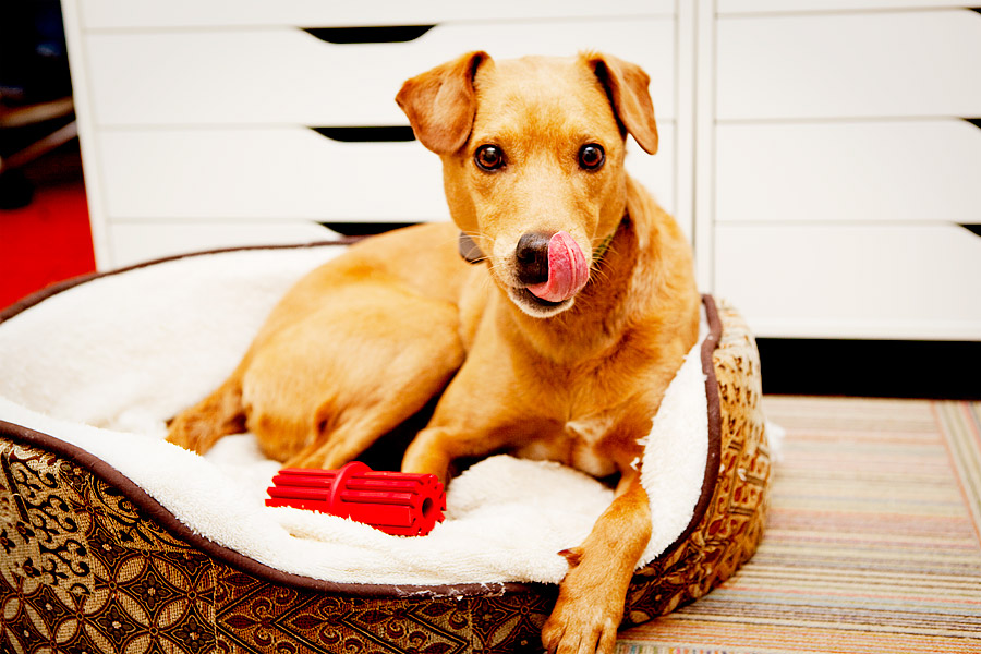 Jon picked up these newfangled Kongs at the vet recently, and here Chuck is enjoying a treat of peanut butter moments before Coco got hold of the toy and chewed it into several hundred tiny pieces. The packaging bragged that it was indestructible, but I guess I should have checked the fine print where it says EXCEPT IF YOUR DOG IS SATAN.
