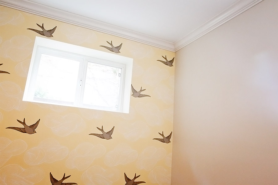 For a second we thought we might put our marriage in jeopardy and try to install this wallpaper ourselves, but then Jon pulled a muscle in his back and I broke a toe. So the good people at a local wallpaper store called Walls The Colour Store put us in touch with a professional wallpaper installer named Tassie who TOTALLY SAVED OUR MARRIAGE. Because of this genius woman our baby will grow up knowing her father. You cannot tell from this picture, but she performed a special mixture of math and magic and made it so that none of the birds have any part of their bodies cut off by walls or windows. Plus, she wallpapered the outlet covers. When I decide to wallpaper the rest of the house she is the person I’m going to call. Any locals who want her info, send me an email and I’ll pass it along.