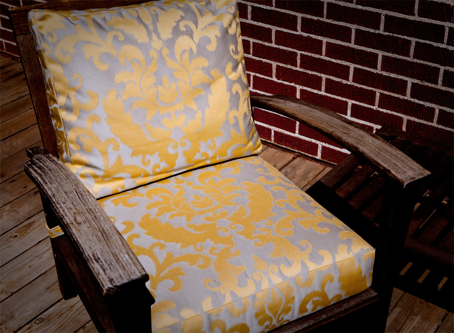 A couple of years ago we bought a relatively cheap set of patio furniture with really bland, tan cushions from Target for the deck right outside our kitchen. But since we never bought covers and never brought the cushions inside, the whole set sort of became unusable. Instead of trashing everything I took the cushions for two of the chairs to a local place and had them measured and then reproduced with this vibrant outdoor fabric. I just fell in love with the ornate yellow pattern against the metallic silver when I saw it and thought it would make a grand, stately contrast to the rustic wood of the chair. So now we have a place for two right outside our kitchen. A place to enjoy the evening, if you will.