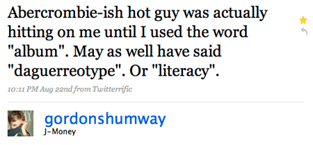 I follow a woman on Twitter named Jelisa Castrodale who goes by the handle gordonshumway, and yesterday I had a good half-hour giggle over this update: