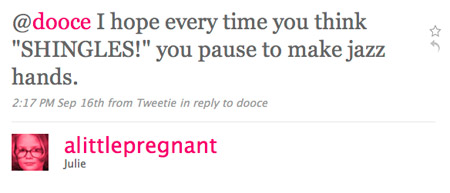 Also, people keep sending me horror stories, like someone’s grandfather had SHINGLES! on his face for seventeen years, and someone else had a case of SHINGLES! that ate the family cat. The absolute best thing sent to me concerning my SHINGLES!, however, was this suggestion from Julie at A Little Pregnant: