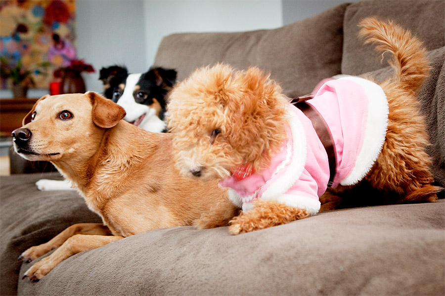 So I’ve learned that Punkin is a Maltipoo (a Maltese crossed with a poodle), and even here with the lens focused on her and the light of the flash going off, I STILL couldn’t get a clear photo of her. This is the least blurry one I got out of about 100 shots. She’s crazy! Let’s not even talk about her outfit! Wonder if I could get Jon to wear something like that. To bed.