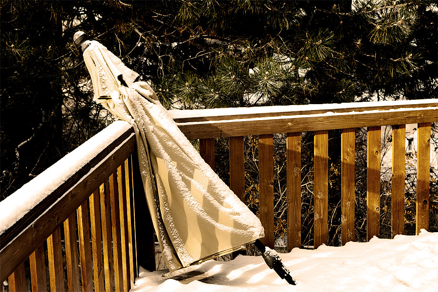 Hibernating Heather B. Armstrong | December 9, 2009 This was the scene this morning on the deck outside our kitchen. Oh, lonely, lonely umbrella, you whom we will not use for another six or seven months. I would hug you but that would be awkward.