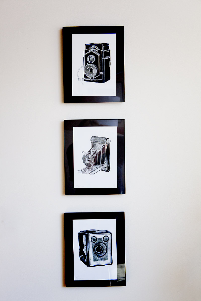 While brainstorming design ideas for the office I decided to collect several pieces of black and white art to scatter throughout the room. I found this set of vintage camera drawings from Christine Berrie’s Etsy shop. Perfect for one of the walls in the meeting area because Jon has at one time or another either owned or used every one of these. I love how the arrangement worked out.