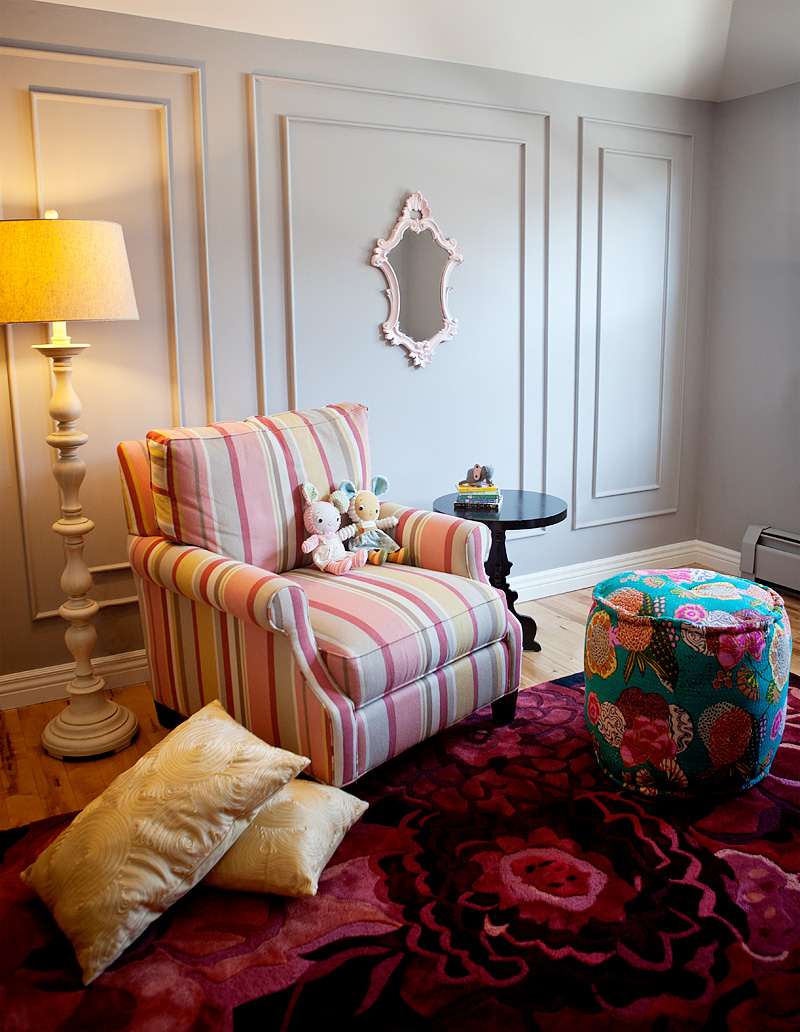 Over the weekend we put the finishing touches on Leta and Marlo’s playroom. It used to be stuffed floor to ceiling with random toys and puzzles and games, no rhyme or reason or organization whatsoever. So we made Leta sit down with us and whittle her collection of things to a manageable few, and the rest we donated. I wanted the room to feel cozy, and I specifically wanted to give Leta a place to crawl up and read all her books. And of course, there had to be pink.
