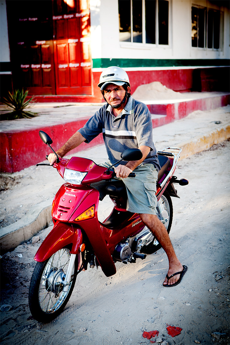 Is it safe to ride a motorbike in flip flops? Yes, he’s wearing a helmet, but wouldn’t he miss his toes given an unseen speed bump?
