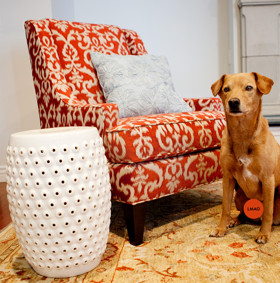 Here Chuck seamlessly ties in the rust color of the chair with the handwoven Persian rug. Just like we paid him to do.