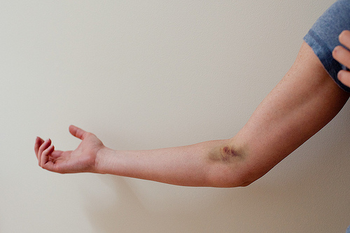 Before she stuck the needle in my arm she remarked that I had great veins for taking blood, SO I KNOW THIS IS NOT MY FAULT. And then BOOP! Needle is in, and all of a sudden she goes, “Oops! Looks like you’re going to have a bruise!”