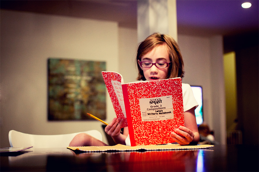 The instructions say that she has to write about a page of something. A poem, a fictional story, perhaps a memory from a vacation. Leta writes four pages and then asks if she can come home from school and keep going. Second grade is just fine, thank you very much.
