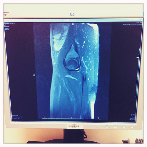 This morning I hobbled into the orthopedic clinic prepared for the worst. And when the doctor pulled up my MRI I totally expected to see a skull and crossbones etched into my hip. No, a laughing skull and crossbones. THE GLASS IS HALF EMPTY.