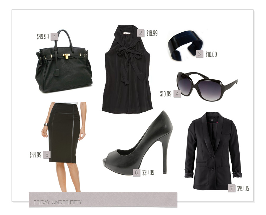 Friday Under Fifty Heather B. Armstrong | October 28, 2011 1. London Office Tote Croc Finish 2. Women’s bow-tie top 3. Recycled vinyl record cuff 4. Vintage Oversized Sunglasses 5. Black pencil skirt 6. Call it SPRING Heels 7. Gently tailored blazer