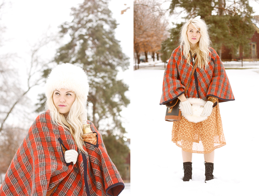 Cape, dress, gloves, hat: thrifted