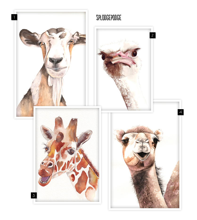 I am a sucker for watercolor (bullet point on my life list is to take a water color class and not fail it). I love the humor in these animal portraits, as if each one were actually posing for a camera. These would go great together along a hallway, each animal greeting you in a British accent as you passed by.