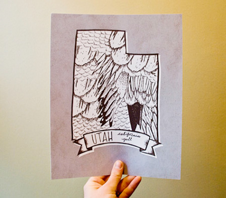 – I love love love these prints of states illustrated according to the pattern and colors of their respective state birds.