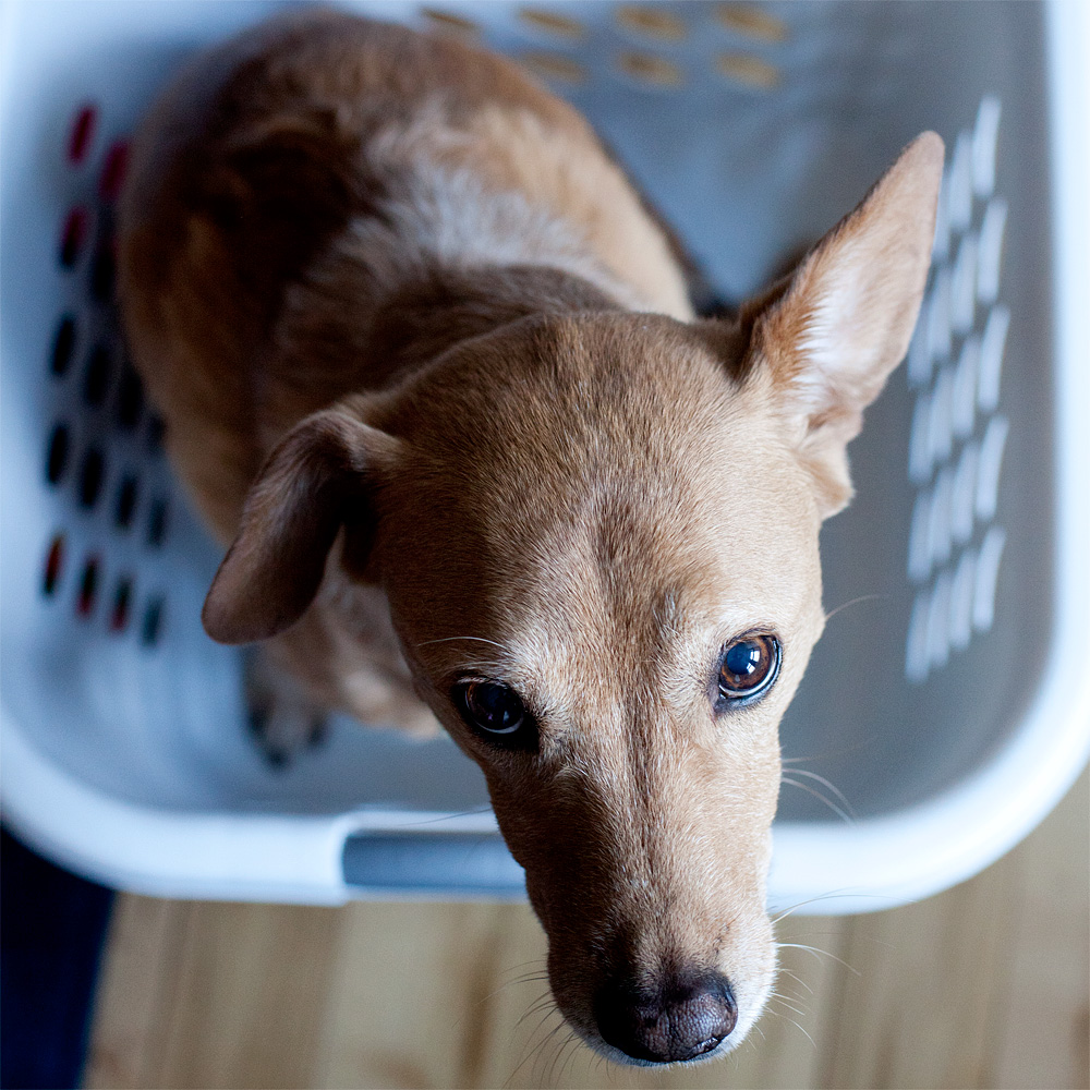 I could come up with a metaphor, but it’s just a dog in a damn laundry basket. Maybe I can find some lines to recite from one of his many poems about death or taxes or rain.