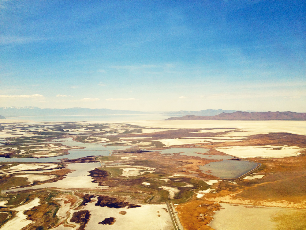 Yesterday afternoon I had a window seat on my flight home from New York and was able to capture the shallow eastern edge of The Great Salt Lake as we landed. There are a few airports I can think of that have distinct views around the landing strips, San Francisco being the most obvious one because I always think the plane is going to land right in the water of San Francisco Bay. In Los Angeles if it isn’t too smoggy you can look out and see the suburban sprawl that goes out beyond the horizon, a bird’s eye view of the gaping scar of humanity. And then there’s Newark that I always associate with that huge IKEA.