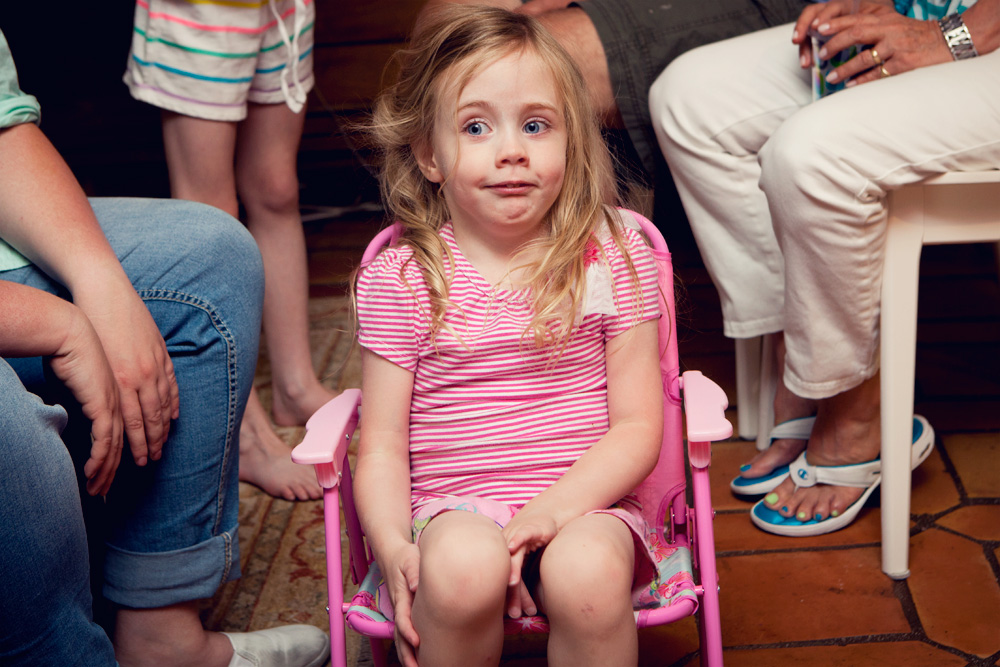 This is what adrenalin does to a newly four-year-old’s face. This kid was HIGH at her birthday party on Friday night, putting on a show for the twenty members of family who had gathered. Dancing, singing, making fart noises. Here she’s sitting in the princess lawn chair my mother bought her (TAKE IT UP WITH MY MOTHER), and I could not get her to make a straight face for me. She was so out of her mind that it was physically impossible. The inevitable crash happened at about six o’clock, and after trying to get her to stay awake just a bit longer I gave up and had to carry her upside down to her bed as she squirmed, started speaking in tongues, and BARKED. She started BARKING.
