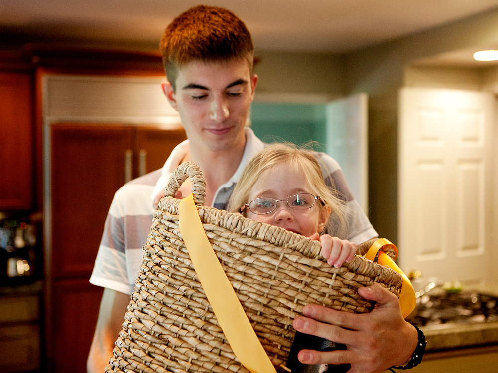 This basket sits next to the back door that leads out onto a patio, and it’s used to hold dog toys and shoes and whatever else gets dragged in from the yard. With the help of Dane, Marlo decided to turn it into her “sthpecthial flying presthent.” He was a good sport and carted her around like this for about twenty minutes. And then it was time to throw her back into the yard where she belongs.
