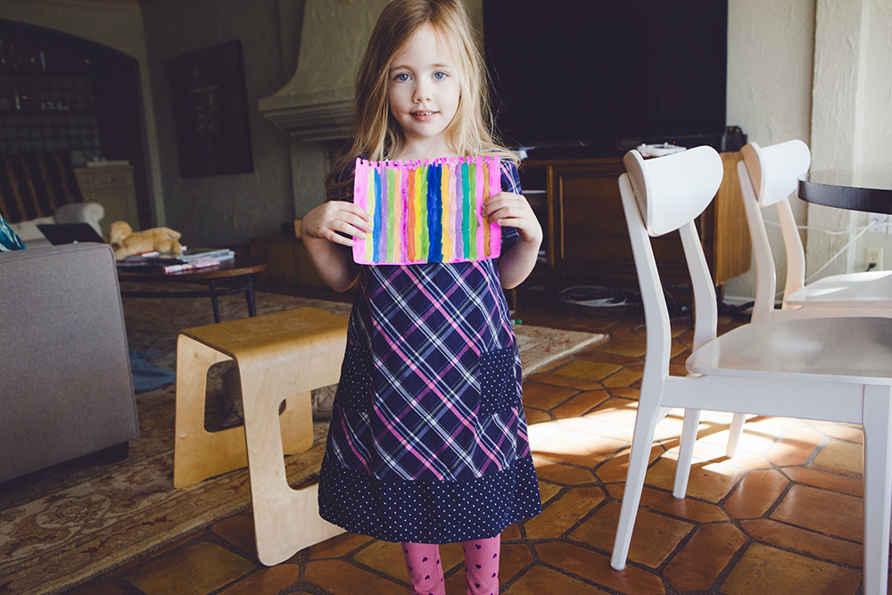 I’m thinking she had a bit of help from her sister with this project considering how straight those lines are. My favorite part is that fact that she colored the part of the paper that was torn out of the spiral notebook. It’s that conscientious of an endeavor. And it matches her dress. Accidental, but we’ll pretend otherwise.