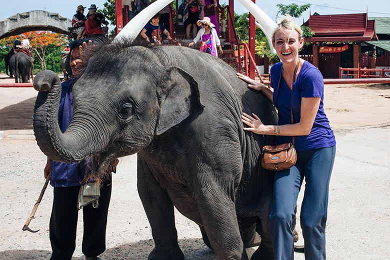 I have always loved elephants, used to collect elephant figurines when I was a kid, have always headed straight for that particular exhibit at the zoo. And here was a baby elephant walking down the street beside our car. My mouth went instantly dry, and you could see my heart pounding in the veins in my neck. Some strange visceral reaction was taking over, so by the time we’d all hopped out of the car I was on the verge of tears. I was the first person to approach it, and its owner? Handler? I’ll just call him “the dude chilling with the baby elephant.” He saw all of our cameras and pulled me over to have my photo taken with it.
