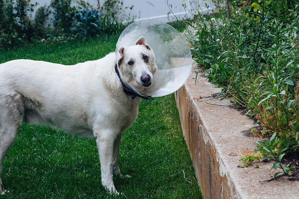 This is my friend Rachel’s dog Kevin, and he recently got into a little situation with another dog. It required surgery and stitches around his left eye, and I feel bad for him, I do, but he has had this thing on for over a week and still doesn’t realize it’s there. It’s a teeny tiny bit hilarious. Just a little bit. He’s enormous. Giant. Mammoth. And he seeks out affection which can be awkward when suddenly you find yourself lying on he ground because a direwolf wanted you to pet his head and a cone has pierced your crotch.