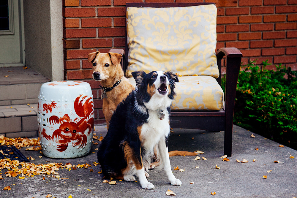 The light this morning was really nice in the front yard so I thought I’d get a more formal shot of both dogs in front of the patio furniture that will very soon go into storage. First a car drove by, then a jogger passed the house. Next, a leaf fell from a tree. As a result I now have a series of forty photos that look almost exactly like this one.