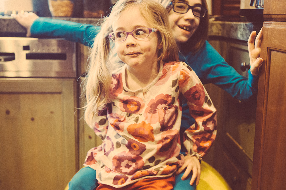 Normally before school I get the two of them ready and then have Leta keep Marlo entertained while I clean myself up, and every morning when I come downstairs to start loading the car I’m always surprised to find them engaged in something different. Sometimes they are playing a game on the iPad, sometimes they are playing house, sometimes they are in the middle of hide and seek. A few days ago they were just like this in the kitchen, Marlo trying to climb into Leta’s lap as Leta balanced on the exercise ball.