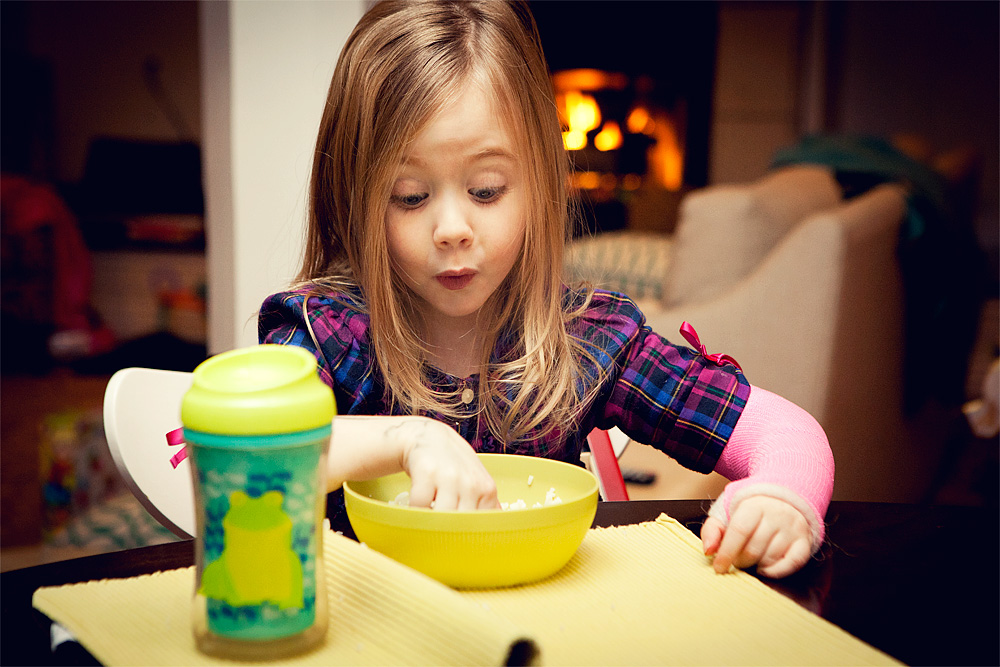 And then there’s Marlo, my rice and chicken and tomato and pepper eating oddity. Sure she’s using her hands here, but this isn’t about my parenting skills and the fact that I do not possess any. She’s eating food! A food that did not originate in America! A food that was not manufactured in a lab!