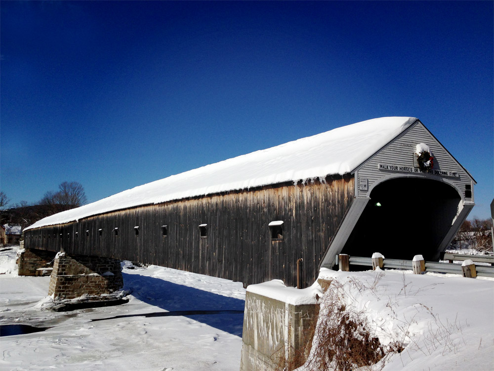 I spent a night over the weekend in Windsor, Vermont at an intimate and cozy bed and breakfast called the Snapdragon Inn (hey Chris and McKay and Michelle!) and then spent an afternoon driving around seeing what the countryside had to offer under three feet of snow. Very nearby is the Cornish–Windsor Covered Bridge, a little piece of American history. I braved the cold for a few minutes outside of the car to grab a few photos and then got right back inside and cursed under my breath for several minutes. Good god, the cold is a different cold in New England. No matter how prepared I think I am I am desperately unprepared. Why didn’t our forefathers just keep going until they hit Southern California and go, “Okay, finally. HERE. We’ll colonize here.”